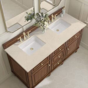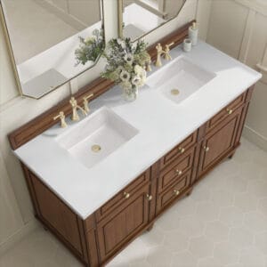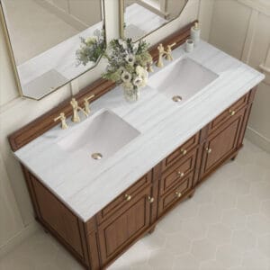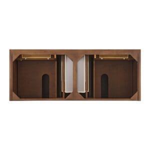 The 60″ Lorelai Double Vanity by James Martin Vanities celebrates timeless form and exquisite finish details, combined with practical function. The beauty of the natural grains in the walnut veneer is accented by reeded details, and clean, raised picture frame molding. The decorative, coin-edge knobs in Champagne Brass provide the perfect complement to the Mid-Century Walnut finish. This two-door cabinet opens to spacious interior with shelves and convenient USB/Electric power outlets. 3 traditional drawers and 2 tip-outs offer additional storage space. Choose one of our 3 cm tops with undermount, rectangular sinks to perfectly complete this masterpiece.
