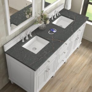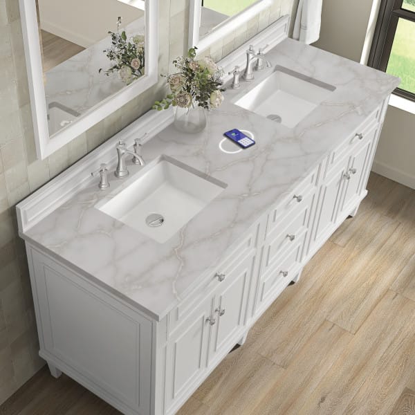 The 72” Lorelai Double Vanity by James Martin Vanities celebrates timeless form and exquisite finish details, combined with practical function. The sophisticated Bright White finish is accented by reeded details, and clean, raised picture frame molding. Coin-edge knobs in Satin Nickel provide the perfect accent. This four-door cabinet opens to a spacious interior with shelves and convenient USB/Electric power outlets. 3 traditional drawers and 2 tip-outs offer additional storage space. Choose one of our 3 cm tops with undermount, rectangular sinks to perfectly complete this masterpiece.