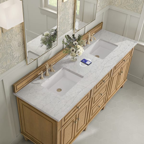 The 72” Lorelai Double Vanity celebrates timeless form and exquisite finish details, combined with practical function. The beauty of the natural grains in the walnut veneer is accented by reeded details, and clean, raised picture frame molding. The decorative, coin-edge knobs in Champagne Brass provide the perfect accent to the Light Natura Oak finish. This four-door cabinet opens to spacious interior with shelves and convenient USB/Electric power outlets. Three traditional drawers and two tip-outs offer additional storage space. Completing this beautiful vanity is a 3cm solid surface Arctic Fall vanity top, which displays horizontal grey veining, giving you the look of classic marble with the benefits of modern technology.