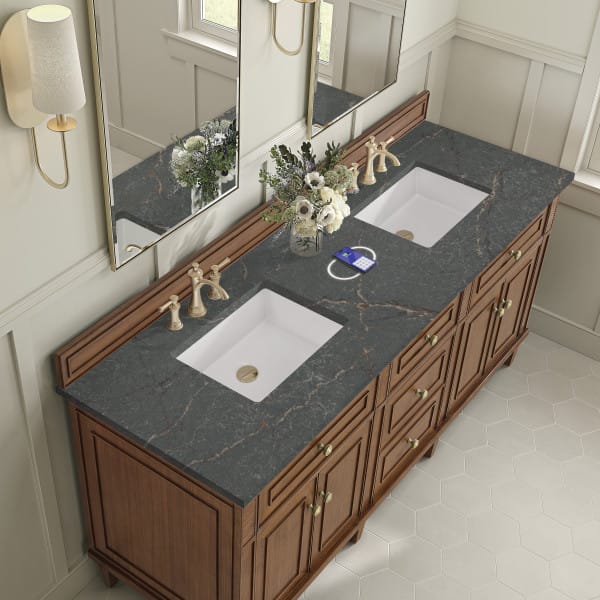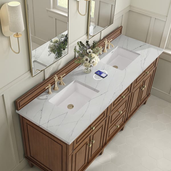 The 72” Lorelai Double Vanity celebrates timeless form and exquisite finish details, combined with practical function. The beauty of the natural grains in the walnut veneer is accented by reeded details, and clean, raised picture frame molding. The decorative, coin-edge knobs in Champagne Brass provide the perfect complement to the Mid-Century Walnut finish. This four-door cabinet opens to spacious interior with shelves and convenient USB/Electric power outlets. Three traditional drawers and two tip-outs offer additional storage space. Completing this beautiful vanity is a 3cm solid surface Arctic Fall vanity top, which displays horizontal grey veining, giving you the look of classic marble with the benefits of modern technology.