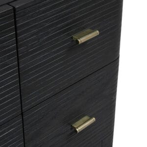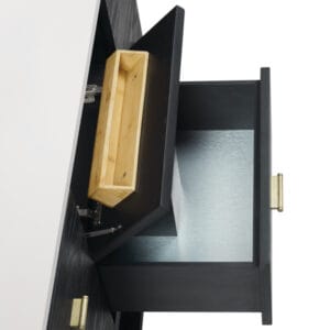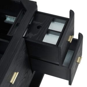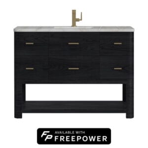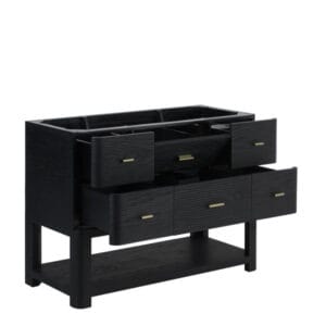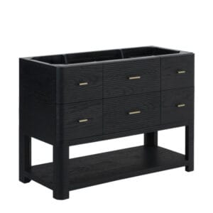 The Lucian 48” single vanity is a visual delight, boasting a rich Carbon Oak finish that adds warmth and character to your space. Complemented by Champagne Brass hardware, the ribbed detailing is meticulously crafted. Enjoy ample storage with one tip-out drawer and three traditional drawers, while a lower exposed shelf adds versatility to your storage solutions.