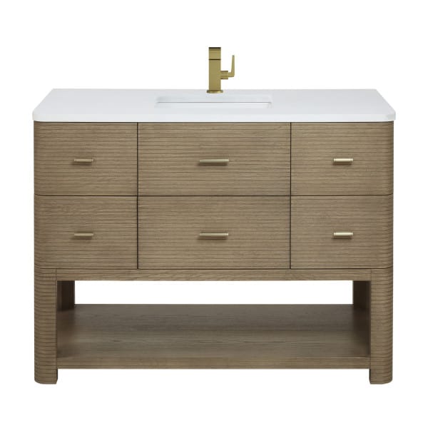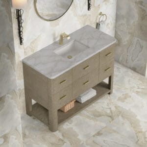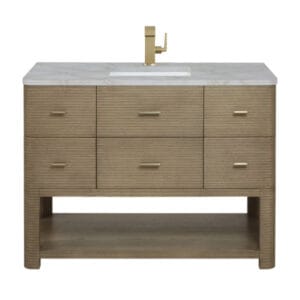 The Lucian 48” single vanity is a visual delight, boasting a rich Pebble Oak finish that adds warmth and character to your space. Complemented by Champagne Brass hardware, the ribbed detailing is meticulously crafted. Enjoy ample storage with one tip-out drawer and three traditional drawers, while a lower exposed shelf adds versatility to your storage solutions.