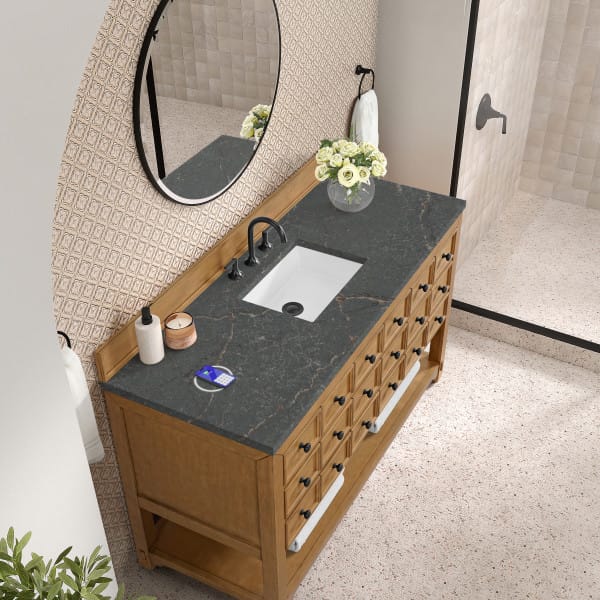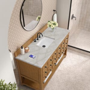 Updated with a contemporary new look, the Malibu Collection effortlessly fuses classic charm with ample storage in the California Mission style. The Malibu 60″ Single Vanity by James Martin Vanities features a warm Amber Birch finish and contemporary Matte Black hardware. Made from solid poplar with birch veneers, this single vanity with nine drawers (one is double-height) and one tip-out drawer; open bottom shelf for extra storage.