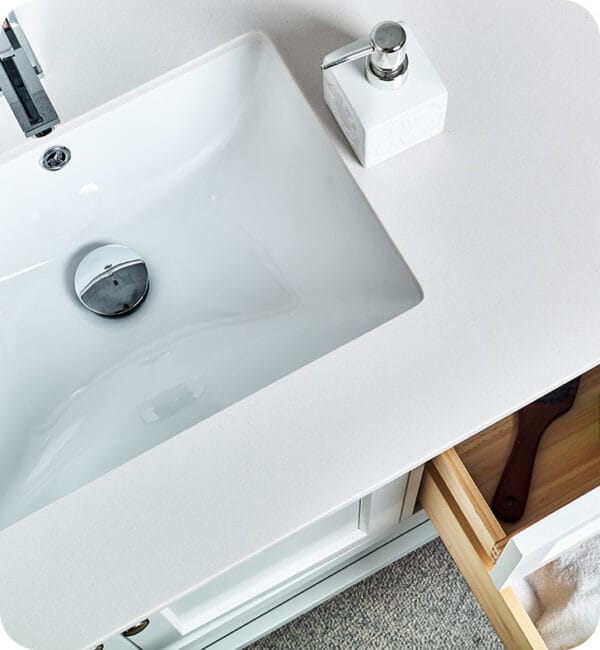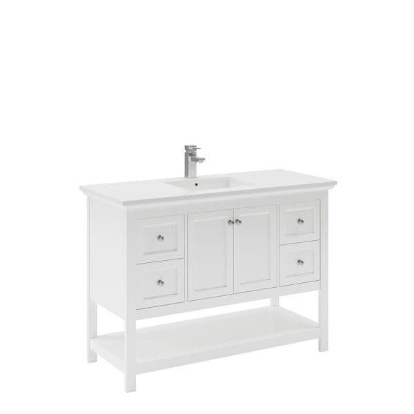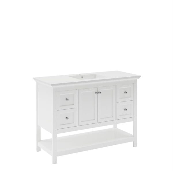 The Fresca Manchester 48″ Vanity blends traditional design and functional storage with a quartz top and ceramic sink. Spacious yet refined, this 48″ Shaker vanity features 4 drawers, soft-close doors, and a quartz countertop for elevated storage.