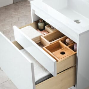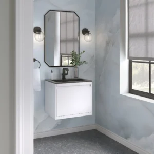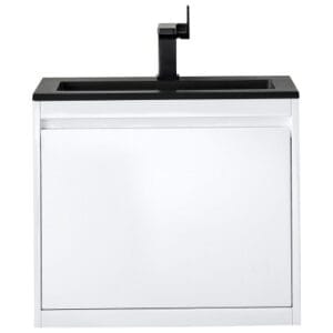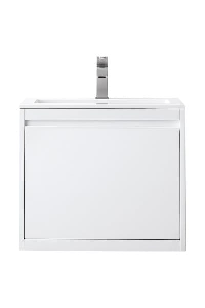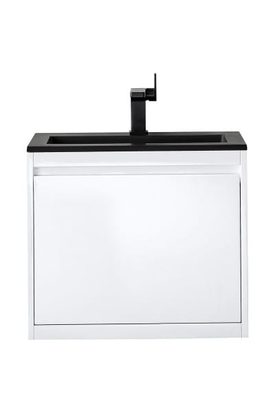 The Mantova 23.6” Glossy White Single Vanity Cabinet by James Martin Vanities will elevate your space by adding a touch of timeless décor to your bathroom. This vanity combines a cutting-edge design with pristine craftsmanship to bring your bathroom a clean modern look providing you with both style and functionality. Generous storage features include soft-close drawers with one removable drawer organizer. The look is completed with a Glossy White or Charcoal Black Composite Stone integrated top and sink.