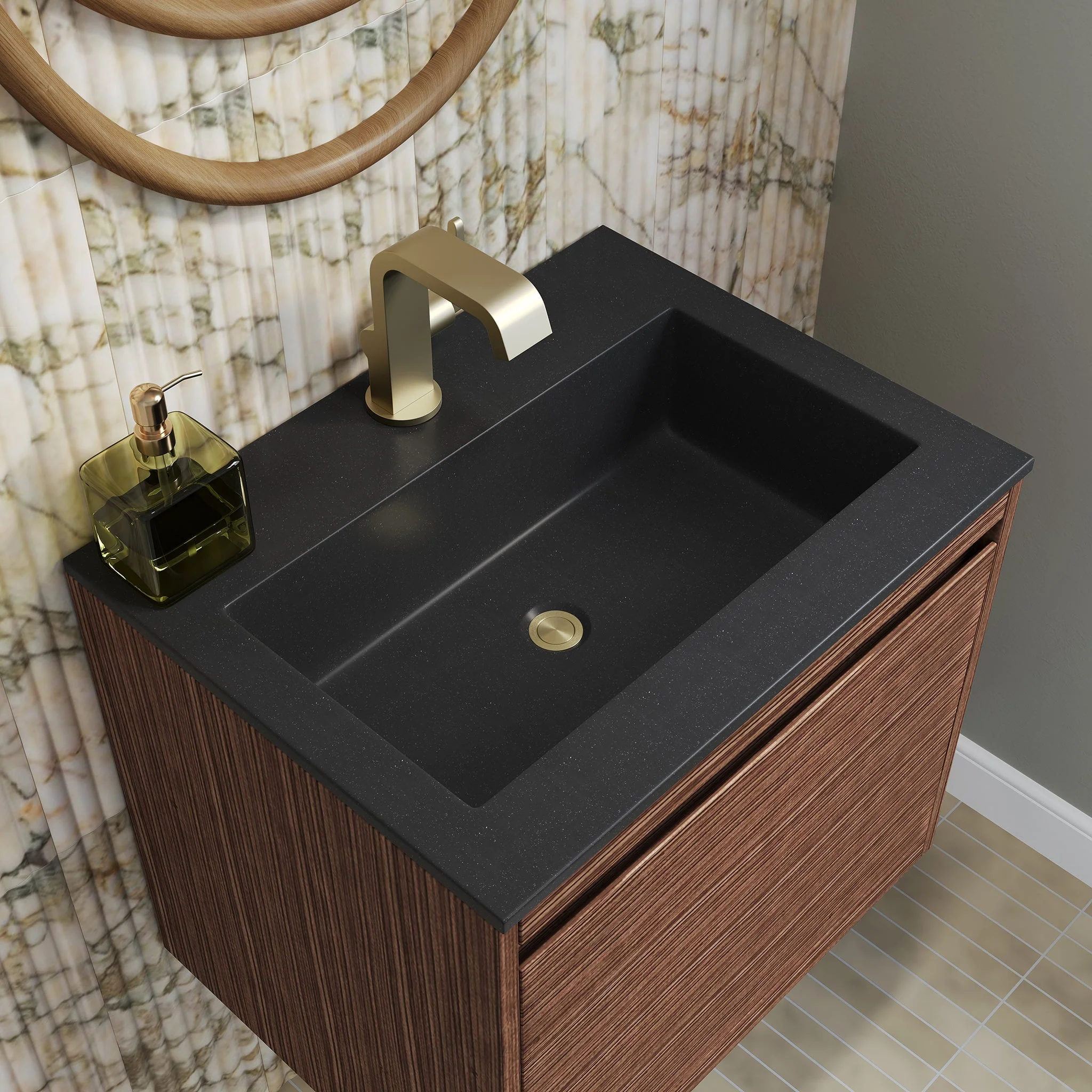 Inspired by the minimalistic Scandinavian aesthetic, the 23.6” Mantova Single vanity in Mid-Century Walnut by James Martin Vanities features clean lines and a geometric silhouette. The Mantova is the perfect blend of modern function and elevated design. For ultimate versatility, this collection can be installed floating or freestanding. Mantova’s sleek design provides a modern look while also providing ample storage including soft-close drawers with one removable drawer organizer. This vanity combines a cutting-edge design with pristine craftsmanship to bring your bathroom both style and functionality. The look is completed with your choice of a Glossy White or Matte Black Composite Stone integrated top and sink.