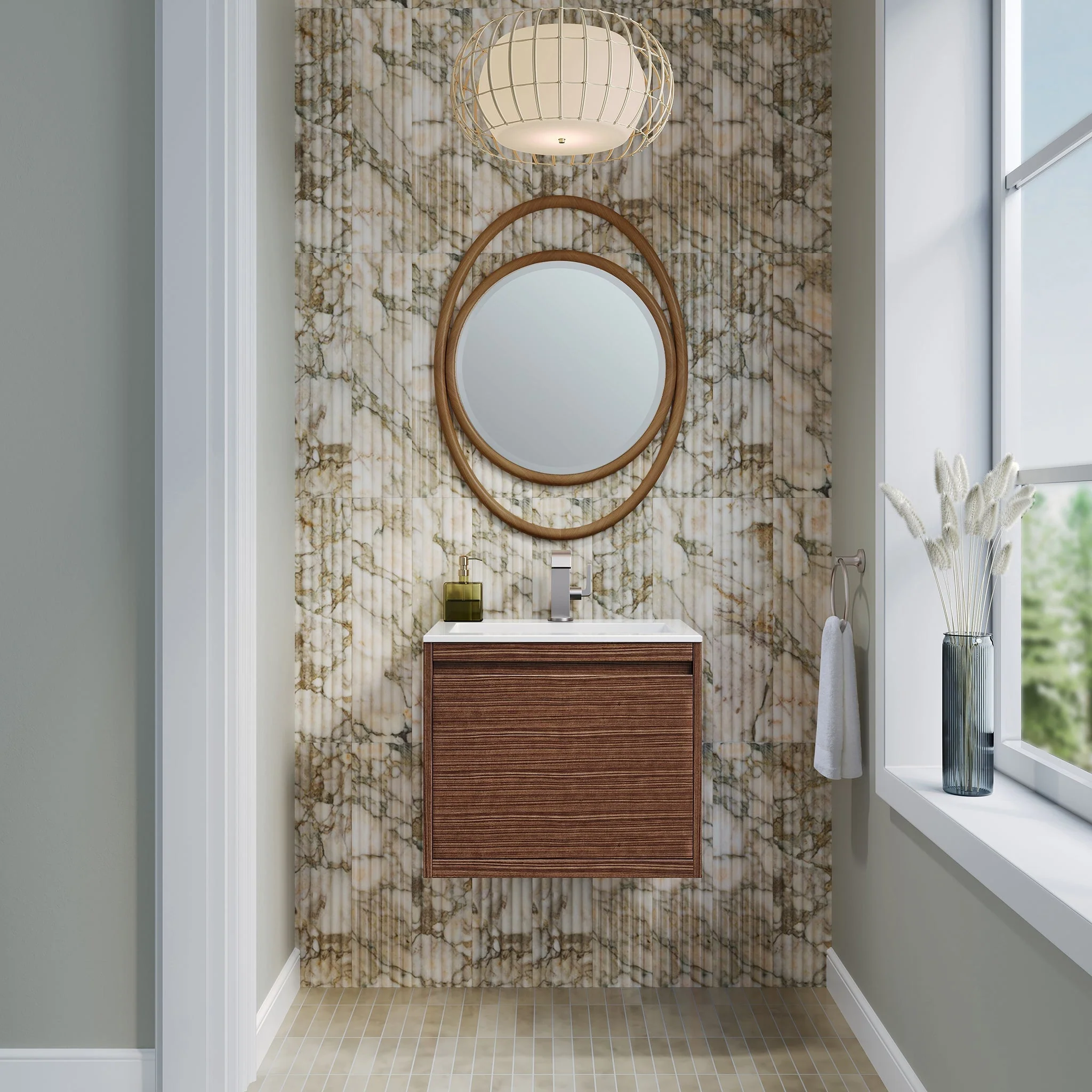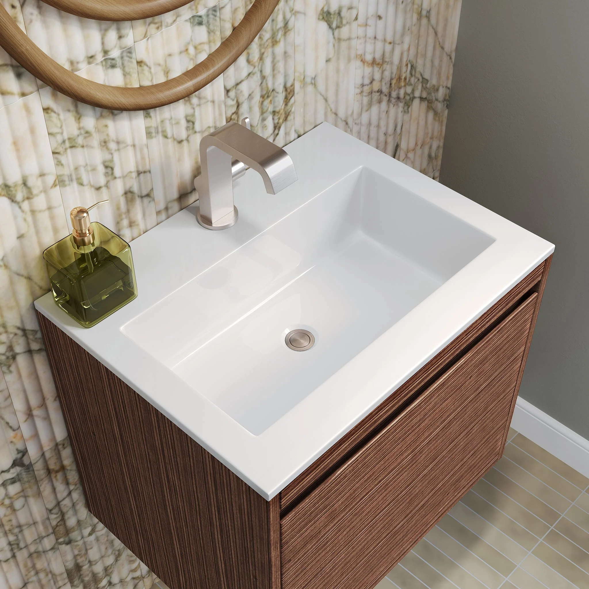 Inspired by the minimalistic Scandinavian aesthetic, the 23.6” Mantova Single vanity in Mid-Century Walnut by James Martin Vanities features clean lines and a geometric silhouette. The Mantova is the perfect blend of modern function and elevated design. For ultimate versatility, this collection can be installed floating or freestanding.