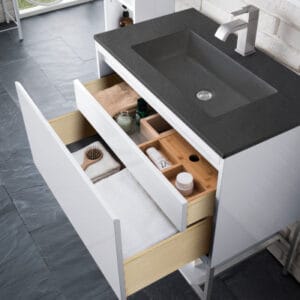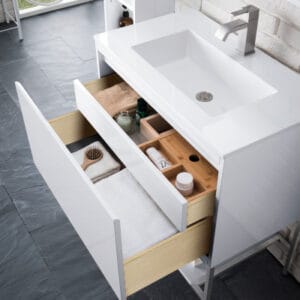 Inspired by the minimalistic Scandinavian aesthetic, the 31.5” Mantova Single vanity in Glossy White by James Martin Vanities features clean lines and a geometric silhouette. The Mantova is the perfect blend of modern function and elevated design. For ultimate versatility, this collection can be installed floating or freestanding. Mantova’s sleek design provides a modern look while also providing ample storage including soft-close drawers with one removable drawer organizer. This vanity combines a cutting-edge design with pristine craftsmanship to bring your bathroom both style and functionality. The look is completed with your choice of a Glossy White or Matte Black Composite Stone integrated top and sink.