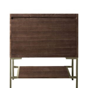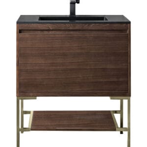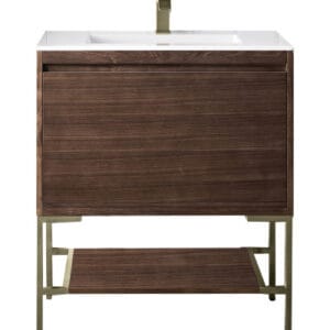 Inspired by the minimalistic Scandinavian aesthetic, the 31.5” Mantova Single vanity in Mid-Century Walnut by James Martin Vanities features clean lines and a geometric silhouette. Set atop a sleek Champagne Brass stainless steel base, the Mantova is the perfect blend of modern function and elevated design.