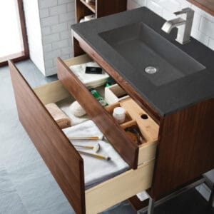Inspired by the minimalistic Scandinavian aesthetic, the 31.5” Mantova Single vanity in Mid-Century Walnut by James Martin Vanities features clean lines and a geometric silhouette. Set atop a sleek Champagne Brass stainless steel base, the Mantova is the perfect blend of modern function and elevated design. For ultimate versatility, this collection can be installed floating or freestanding. Mantova’s design provides a modern look while also providing ample storage including soft-close drawers with one removable drawer organizer. This vanity combines a cutting-edge design with pristine craftsmanship to bring your bathroom both style and functionality. The look is completed with your choice of a Glossy White or Matte Black Composite Stone integrated top and sink.