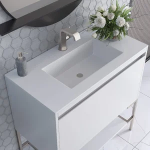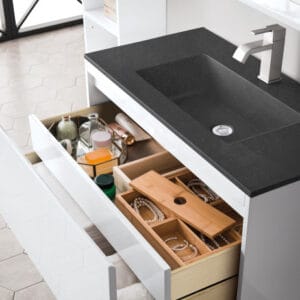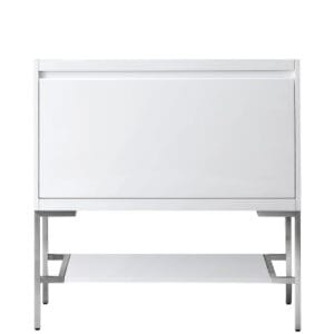 Inspired by the minimalistic Scandinavian aesthetic, the 35.4” Mantova Single vanity in Glossy White by James Martin Vanities features clean lines and a geometric silhouette. Set atop a sleek Brushed Nickel stainless steel base, the Mantova is the perfect blend of modern function and elevated design. For ultimate versatility, this collection can be installed floating or freestanding. Mantova’s design provides a modern look while also providing ample storage including soft-close drawers with one removable drawer organizer. This vanity combines a cutting-edge design with pristine craftsmanship to bring your bathroom both style and functionality. The look is completed with your choice of a Glossy White or Matte Black Composite Stone integrated top and sink.
