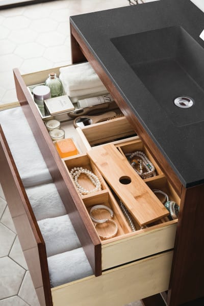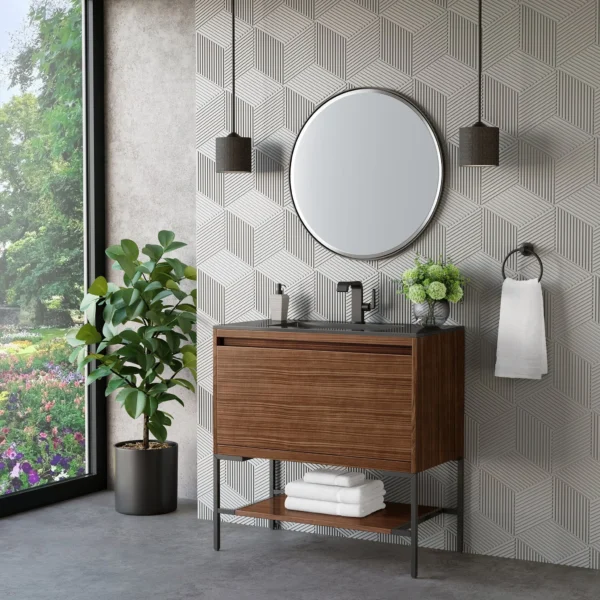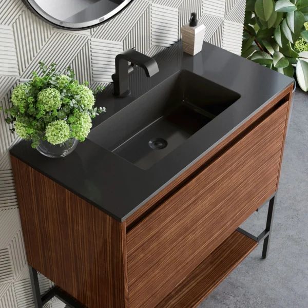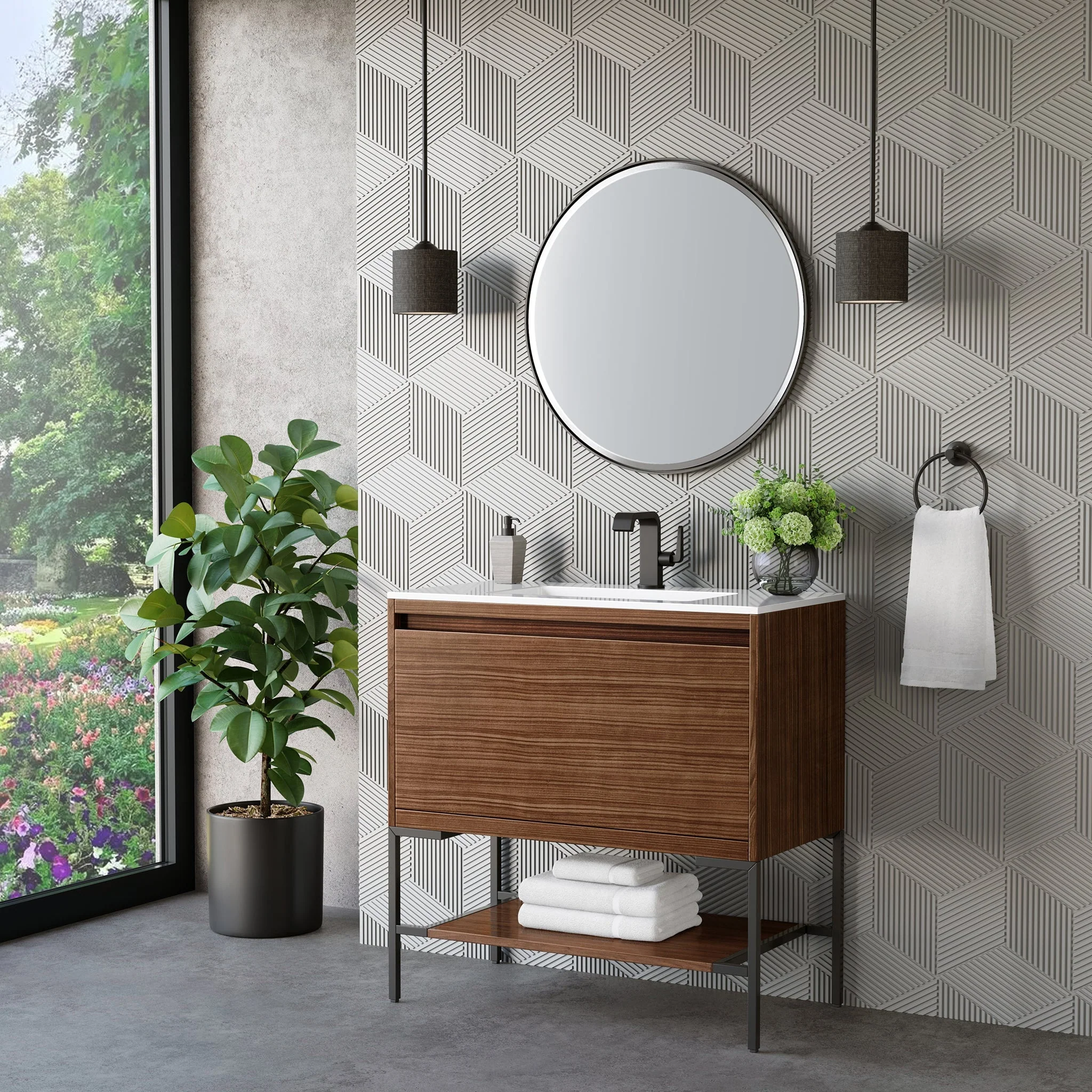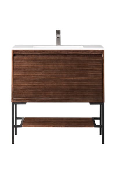 The Mantova 35.4” Mid-Century Walnut Single Vanity Cabinet by James Martin Vanities will elevate your space by adding a touch of timeless décor to your bathroom. This vanity combines a cutting-edge design with pristine craftsmanship to bring your bathroom a clean modern look providing you with both style and functionality. Generous storage features include soft-close drawers with one removable drawer organizer. Matte Black finished Stainless Steel Base is included. The look is completed with a Glossy White or Charcoal Black Composite Stone integrated top and sink.