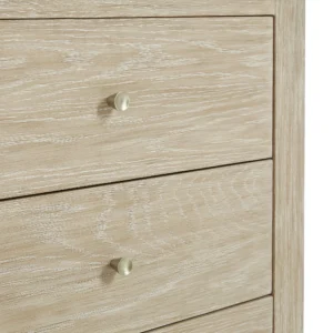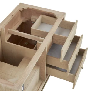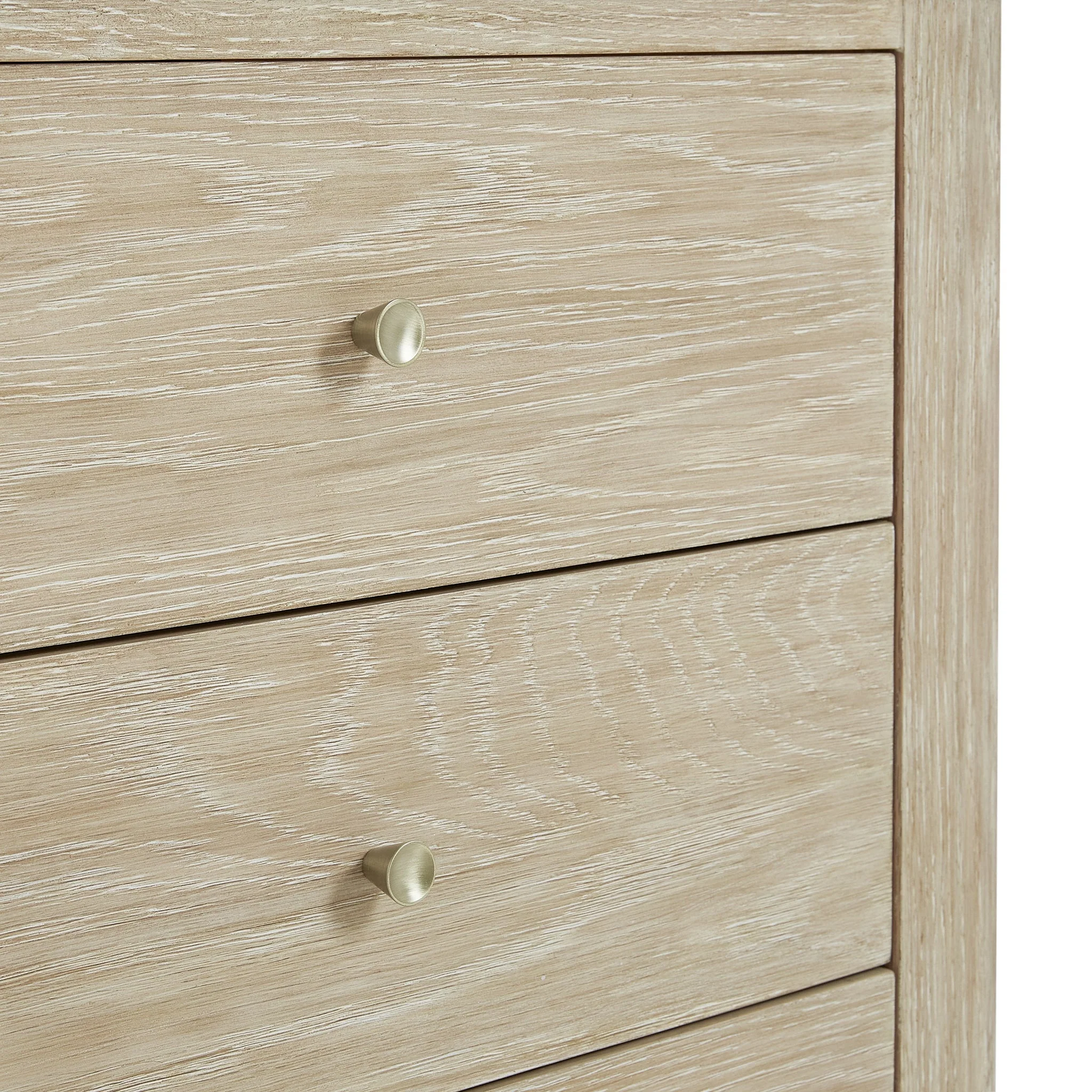 Crafted with precision, the understated waterfall frame of the Marigot 48” Single Vanity is adorned with tambour doors, adding a touch of elegance to its contemporary design. The cerused Sunwashed Oak finish creates a captivating warmth that is accentuated by Champagne Brass hardware. 3 drawers and one tambour door with an interior shelf and drawer provide ample storage while maintaining a sleek profile.