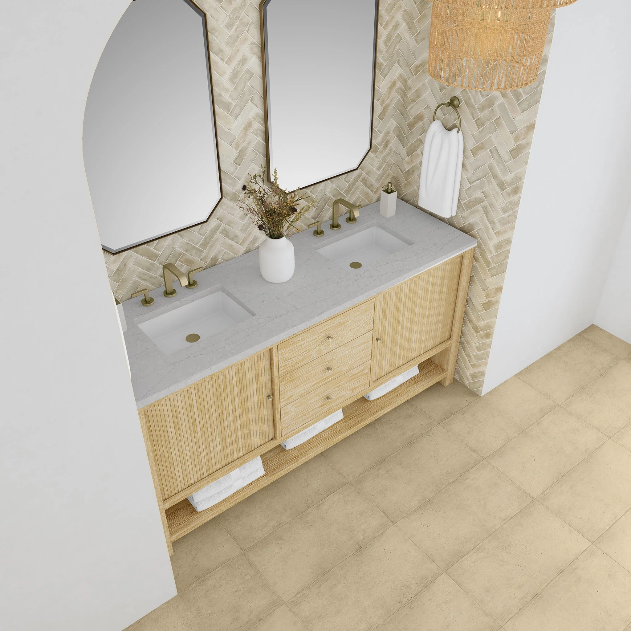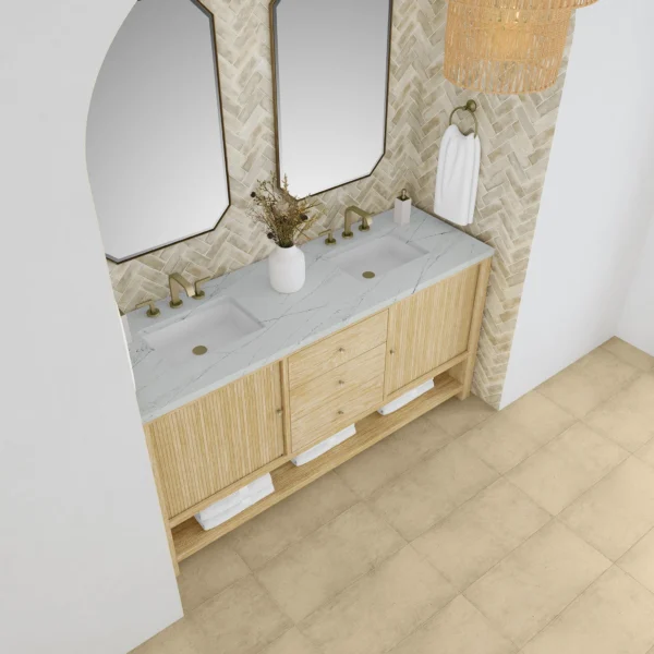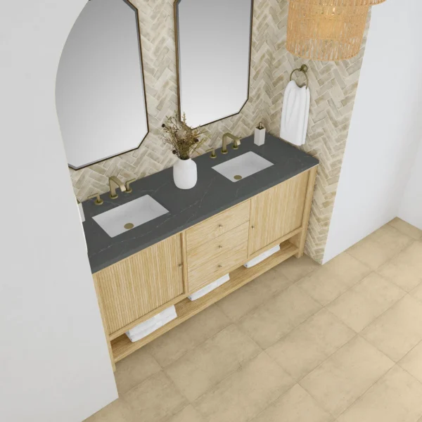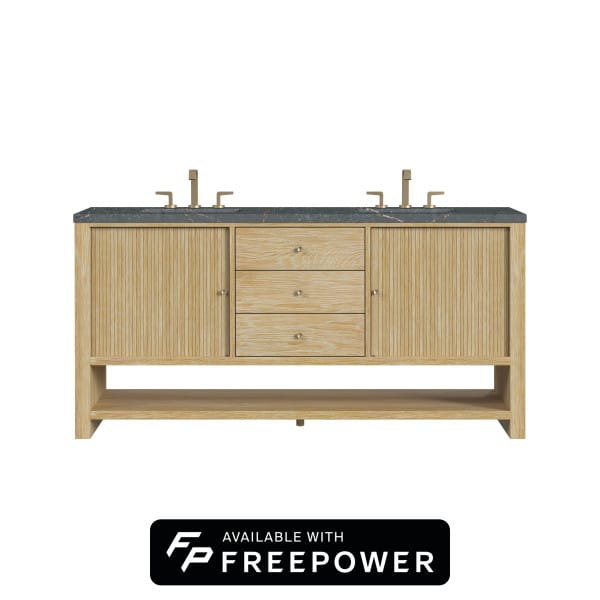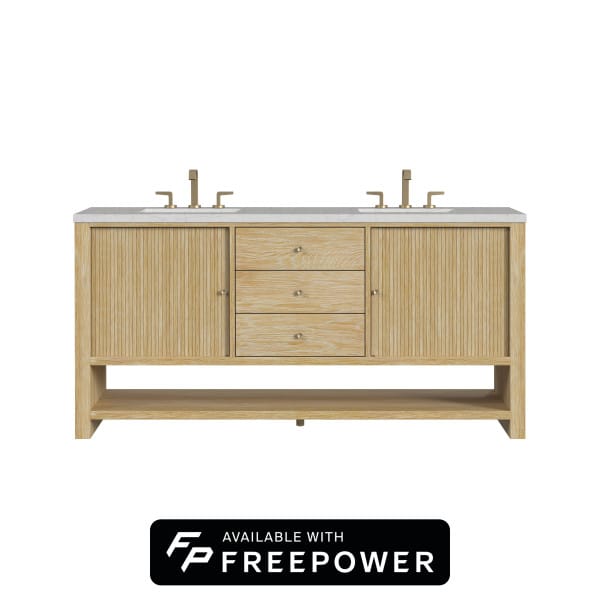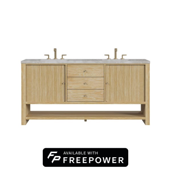 Crafted with precision, the understated waterfall frame of the Marigot 72” Double Vanity is adorned with tambour doors, adding a touch of elegance to its contemporary design. The cerused Sunwashed Oak finish creates a captivating warmth that is accentuated by Champagne Brass hardware.