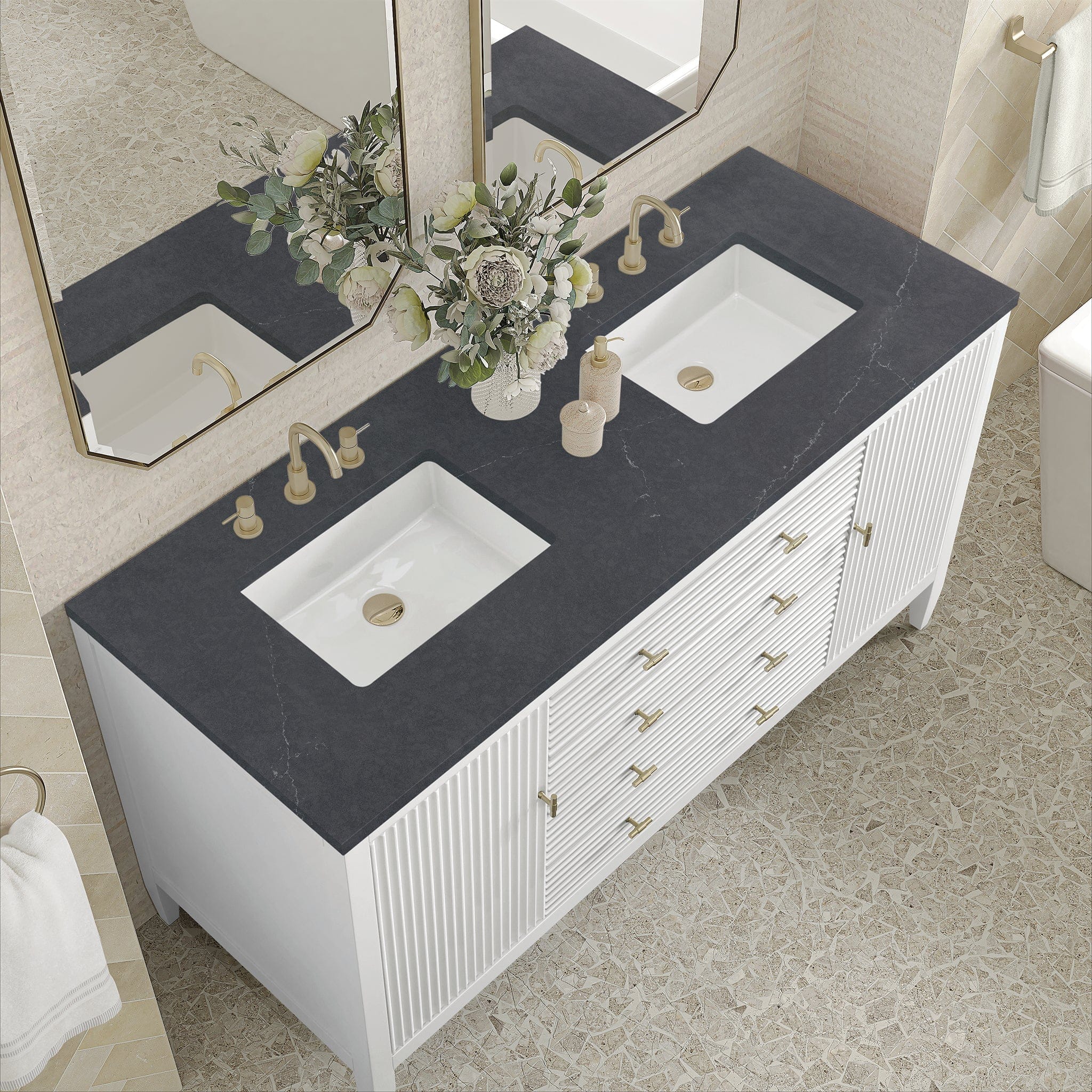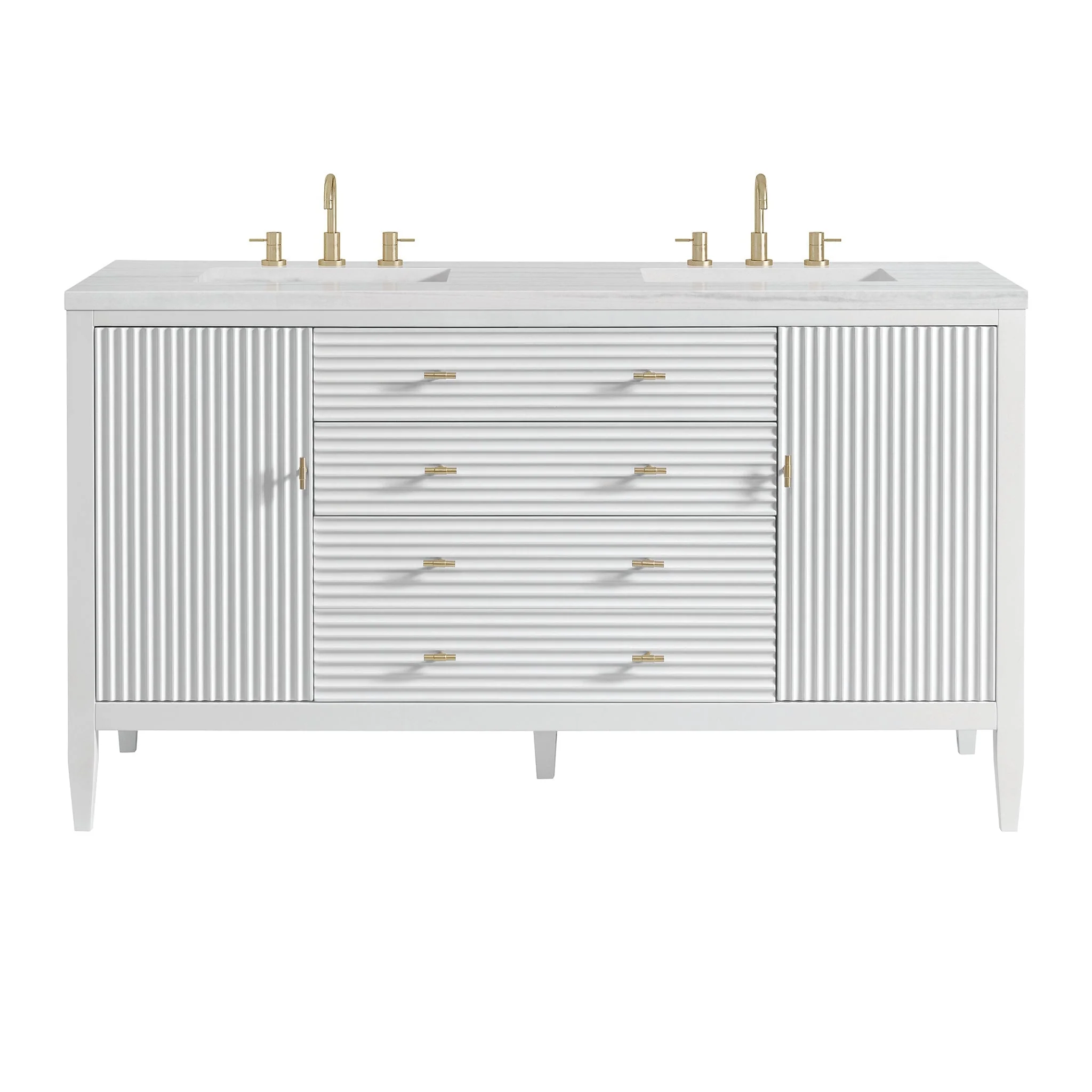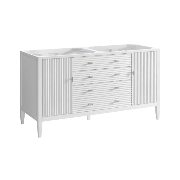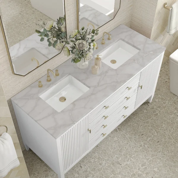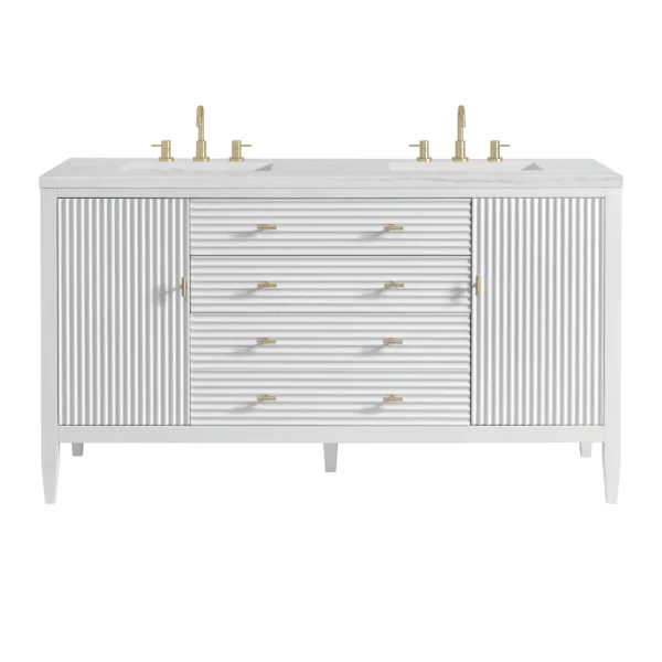 The 60″ Myrrin Double Vanity features a minimalistic silhouette with fluted details, resulting in a blend of classical elegance and contemporary design. The deeply fluted panels run perpendicular on the doors and drawers, adding sophistication and visual interest to the design. Toggle-style knobs in Champagne Brass provide a luxe accent to the rich Bright White finish.
