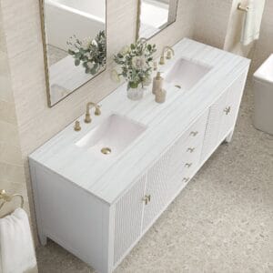 The 72″ Myrrin Double Vanity features a minimalistic silhouette with fluted details, resulting in a blend of classical elegance and contemporary design. The deeply fluted panels run perpendicular on the doors and drawers, adding sophistication and visual interest to the design. Toggle-style knobs in Champagne Brass provide a luxe accent to the rich Bright White finish.