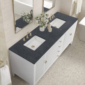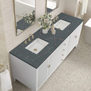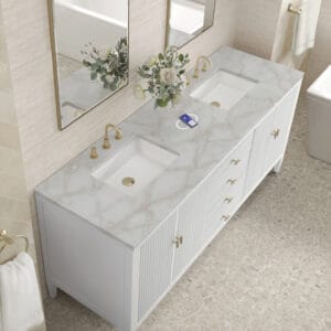 The 72″ Myrrin Double Vanity features a minimalistic silhouette with fluted details, resulting in a blend of classical elegance and contemporary design. The deeply fluted panels run perpendicular on the doors and drawers, adding sophistication and visual interest to the design. Toggle-style knobs in Champagne Brass provide a luxe accent to the rich Bright White finish. The four-door cabinet opens to a spacious interior with a single shelf and convenient USB/Electric power outlets. 3 drawers lend additional storage. Choose one of our 3 cm tops with undermount, rectangular sinks to perfectly complete this masterpiece.