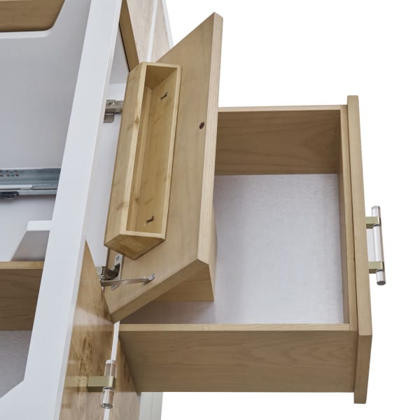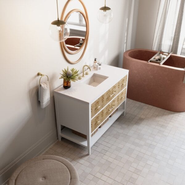 Indulge in the artistry of the Olena 48” single vanity — where craftsmanship meets the natural beauty of Mappa Burl. Each detail has been thoughtfully curated for style and functionality. This vanity boasts ample storage with one tip-out, five drawers, and an integrated lower shelf. The acrylic and Brass pulls accentuate the beauty of the Burl drawers.