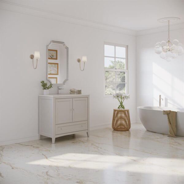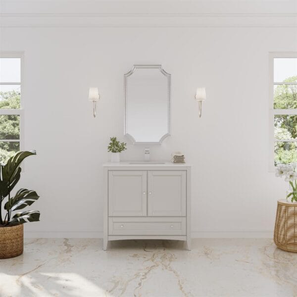 This vanity set comes with a coordinating 32″ x 32″ mirror, framed in solid wood for a seamless, elegant look.