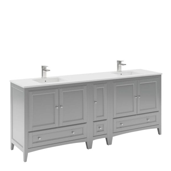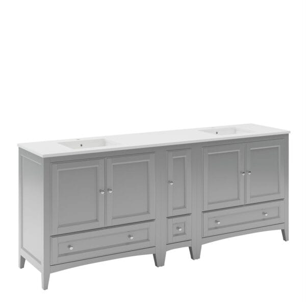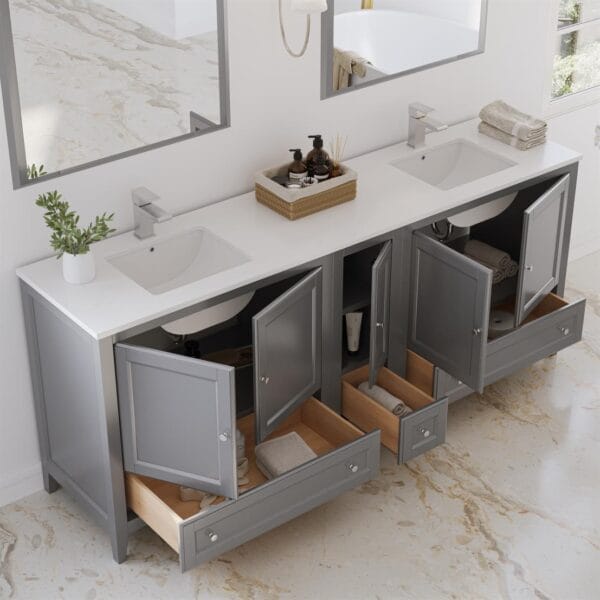 Refine your bathroom with the Fresca Oxford 84” Traditional Bathroom Vanity Set, featuring a solid wood frame, premium quartz countertop, soft-close storage and two matching mirrors. With timeless elegance and ample space, this vanity is the perfect blend of style and functionality.