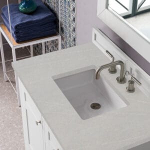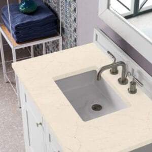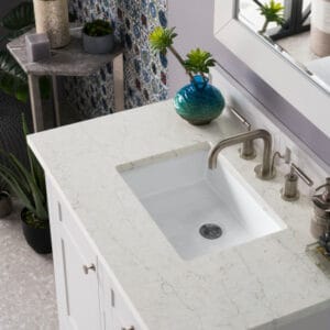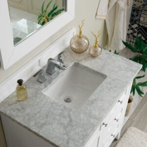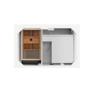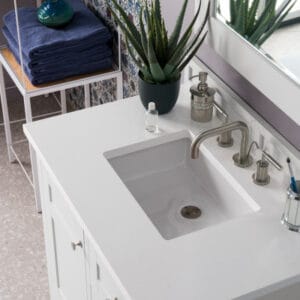 The Palisades 36″ Bright White Single Vanity features one door with interior shelf space, two drawers, and tapered legs. Premium features include an electrical and USB outlet located on a custom designed shelf behind the door and a bamboo drawer organizer. Shaker made modern, Palisades was designed to lend a modern flair to traditional Shaker-style cabinets.