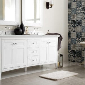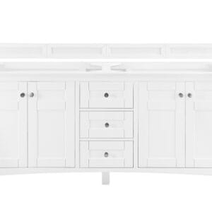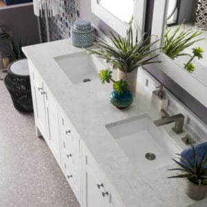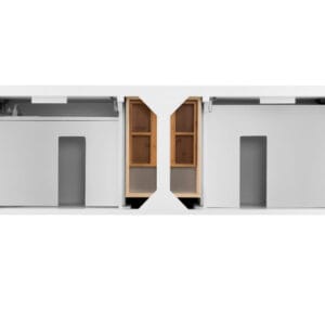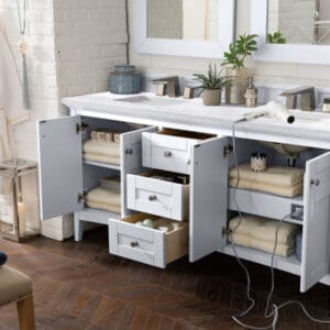 The Palisades 72″ Bright White Double Vanity features four doors with two interior shelves, three drawers, and tapered legs. Premium features include an electrical and USB outlet located on a custom designed shelf behind the door and a bamboo drawer organizer. Shaker made modern, Palisades was designed to lend a modern flair to traditional Shaker-style cabinets.