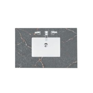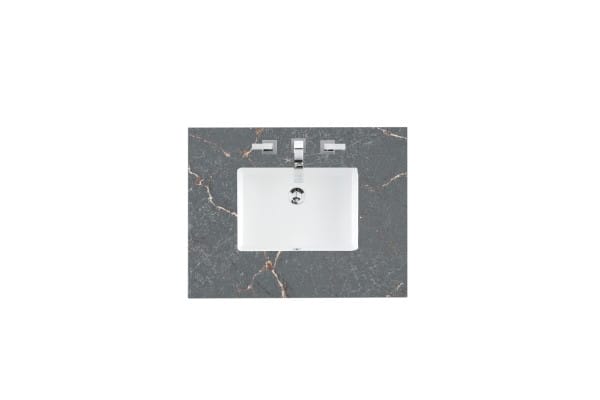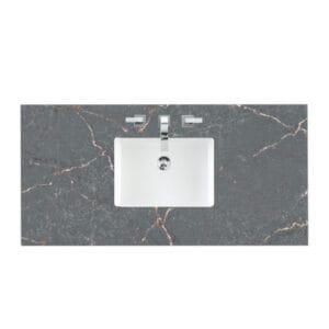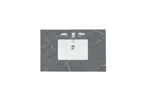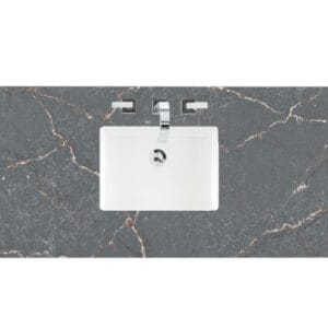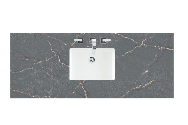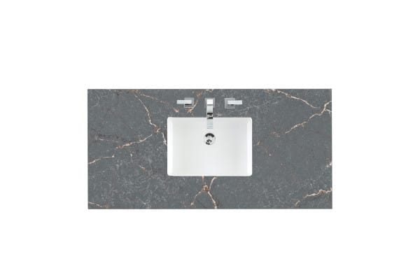 Featuring intricate neutral veining and striking copper accents coursing through deep blue hues, the Parisien Bleu Silestone Countertop brings depth and dimension to the surface of your vanity. The shimmering accents highlight the shades of blue beautifully through the polished finish, creating an elegant look for any space.