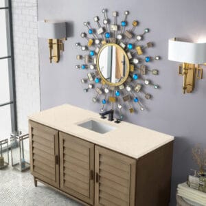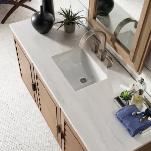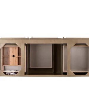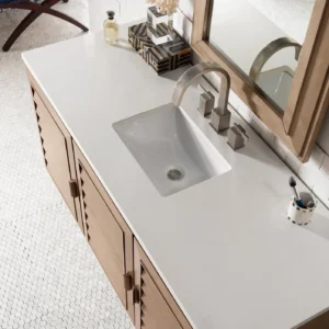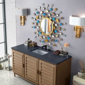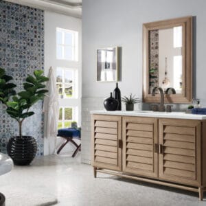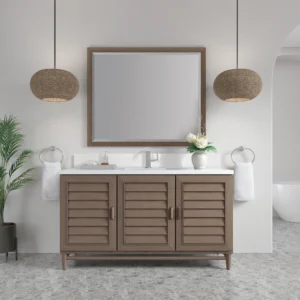 The Portland 60” single vanity is a beautiful blend of Mid-Century and relaxed Coastal styles. Its three doors open to reveal one shelf and seven interior drawers, providing ample storage for bathroom essentials. Sleek wooden handles and louvered doors lend an air of simplicity to this piece, making it the ideal choice for a timeless bathroom design.