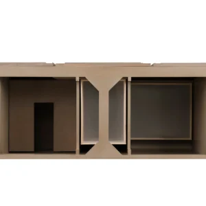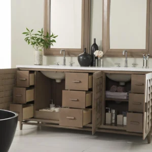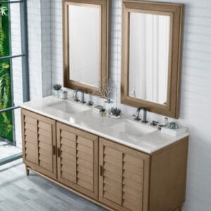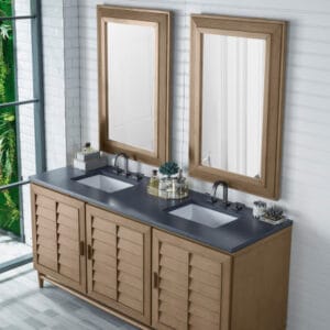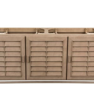 The Portland 72” double vanity is a beautiful blend of Mid-Century and relaxed Coastal styles. Its three doors open to reveal one shelf and ten interior drawers, providing ample storage for bathroom essentials. Sleek wooden handles and louvered doors lend an air of simplicity to this piece, making it the ideal choice for a timeless bathroom design.