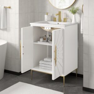 Tap into mid-century aesthetics with the Render Vanity. Render Bathroom Vanity features a durable particleboard frame with smooth laminate, four tapered wood legs, and adjustable storage shelf behind a soft-close hinged door.